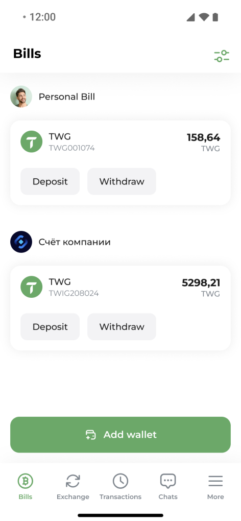Click the "Add" button located in the top menu of Twigse. Alternatively, you can add a wallet when depositing, withdrawing, or exchanging digital currencies.