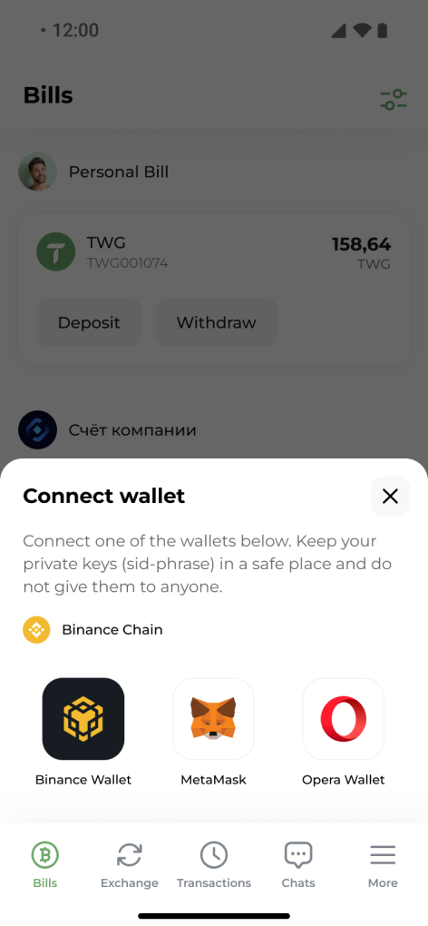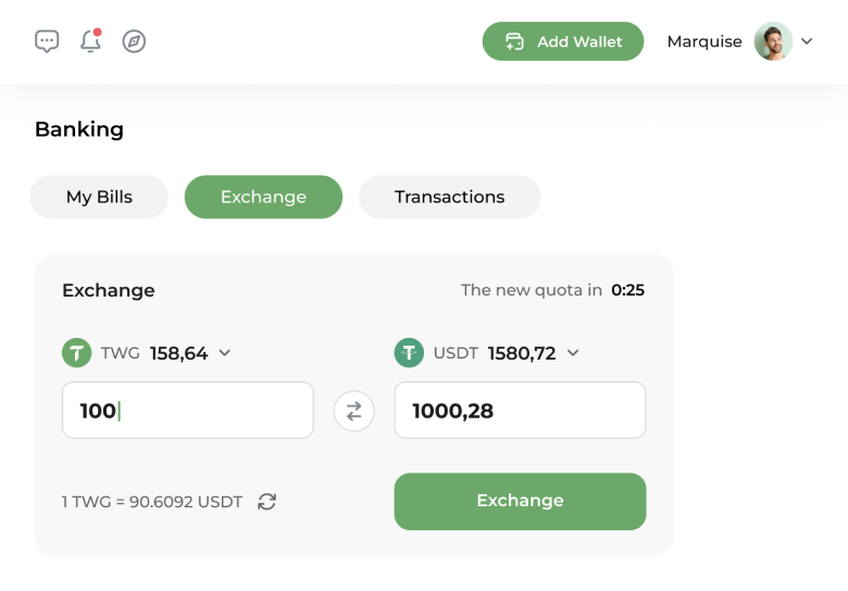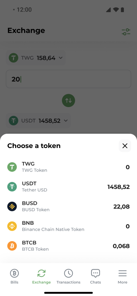 Enter the required amount of TWG. It will be converted to USDT and sent to your account in one of the previously connected wallets (Trust Wallet, MetaMask, or Opera Wallet).