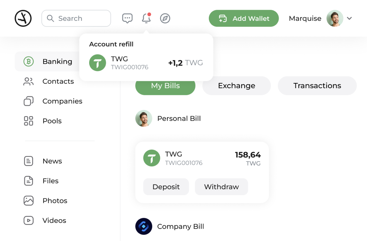 Use TWG to send money to friends and businesses, purchase goods, and exchange it for other digital currencies.