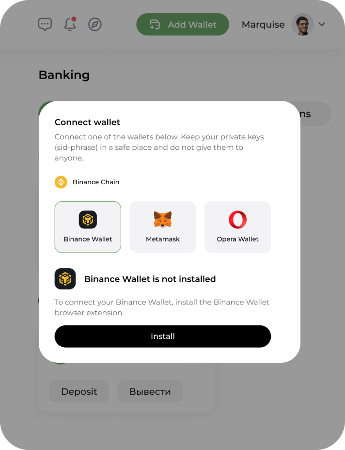 Choose one of the available wallets: Trust Wallet, MetaMask, or Opera Wallet. Follow the provided installation instructions to set up your chosen wallet.