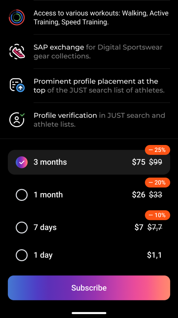 By choosing a 1-year plan, you gain the ideal conditions to embark on your JUST career at a discounted price. You also enjoy uninterrupted access to various workouts and new Digital Sportswear collections.