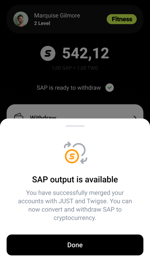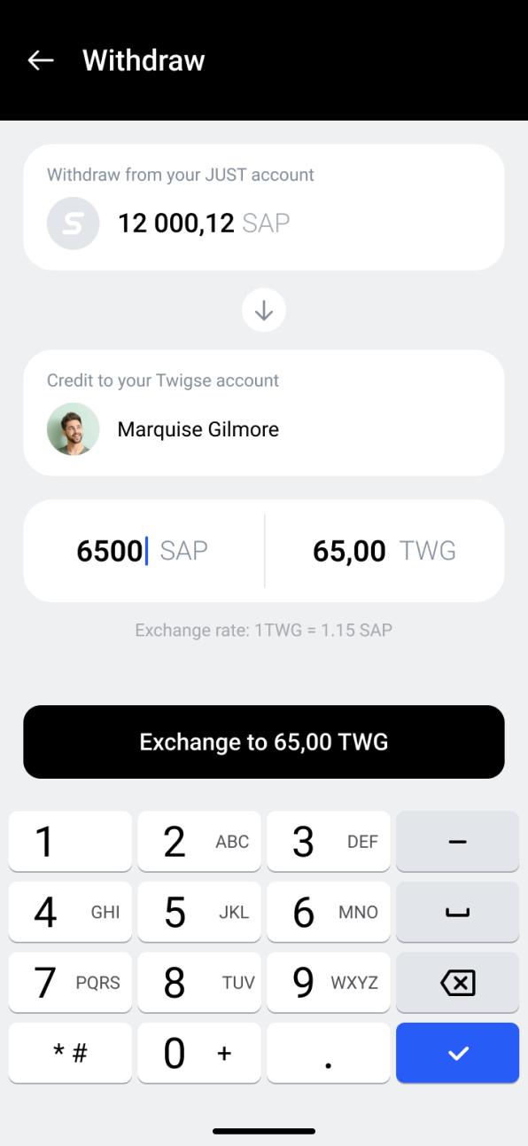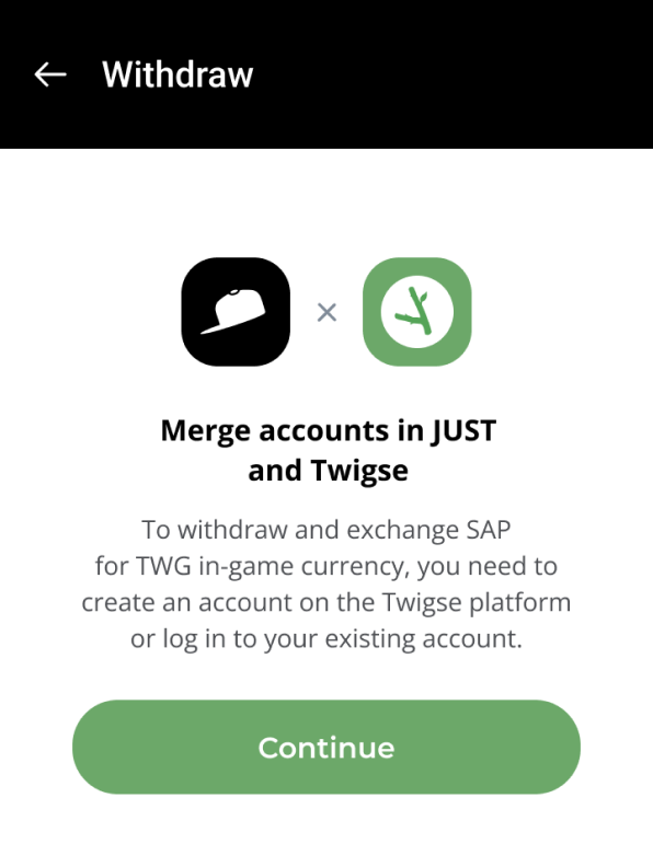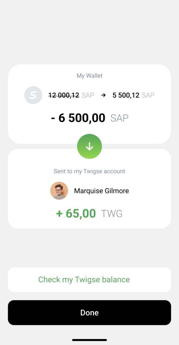 By clicking the 'Withdraw' button, you can check the current SAP to TWG exchange rate, input the desired amount of SAP, and proceed to exchange SAP for TWG, transferring it to your Twigse account.